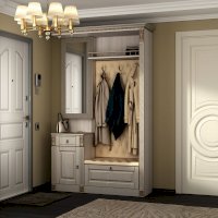 Прихожая выполнена в классическом стиле с декоративными элементами. Фасады и декоративные элементы патинированы, патина наносится вручную, по классической итальянской технологии и защищена матовым лаком. Мягкие элементы (вешалка и сиденье) выполнены из экокожи, декорированы каретной стяжкой.