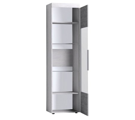 Посудный шкаф со стеклянной дверцей позволит выставить в гостиной те коллекционные и памятные вещицы, которыми вы дорожите. Стеклополки в обработке еврокромкой выдерживают до 10 кг каждая. Их можно декоративно подсветить с помощью светодиодной подсветки (в комплекте не поставляется, приобретается отдельно). Фасад перенавешивается на левую и правую сторону. Серебристая стильная ручка из массива дерева и серое тонирование стекло фасада вносят смелые дизайнерские штрихи в восприятии актуального декора "под бетон".