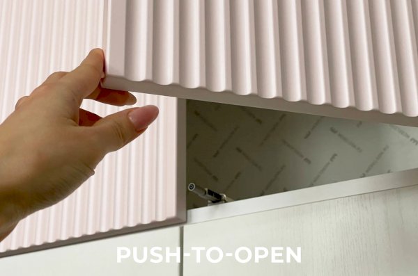 Однако, не только внешний вид делает этот шкаф уникальным! Бесшумное закрывание фасадов обеспечивает комфорт и позволит вам избежать неприятных звуков. А толкатель push latch вместо обычных ручек добавляет современности и удобства в использовании.