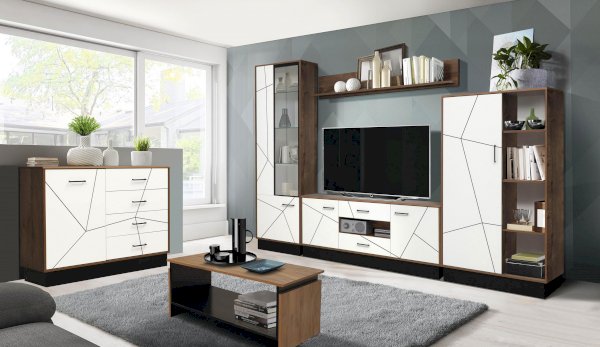 Абсолютно уникальный шкаф! В отличие от своих мебельных коллег, он имеет сравнительно небольшую высоту – всего 1575 мм. В мебельной группе со стандартно высоким шкафом-пеналом выглядит интересно. Разные уровни высоты делают модульную систему необычной. Внутренняя наполняемость шкафа состоит из полок – за счет высоты шкафа их всего четыре, а не пять, как обычно. Но зато они есть в каждом отсеке из двух, и в сумме получается целых восемь. Левая часть шире, правая – уже. Здесь представлен принцип асимметрии. Левая часть закрыта сплошной дверцей, а вот правая – на виду. Она полностью открыта и не нуждается даже в стеклянной дверце!